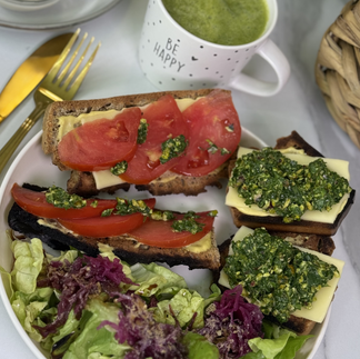 Au goûter une tarte au yaourt végétal et prunes, et un thé glacé pêche et citron, et le soir, des bruschettas de pain de mie sans farine, une recette que j’adore, avec moutarde, fromage vegan, tomate et pesto roquette basilic huile d’olive ail et pignon, salade et chou fermenté, soupe brocolis haricots oignon et cumin.
