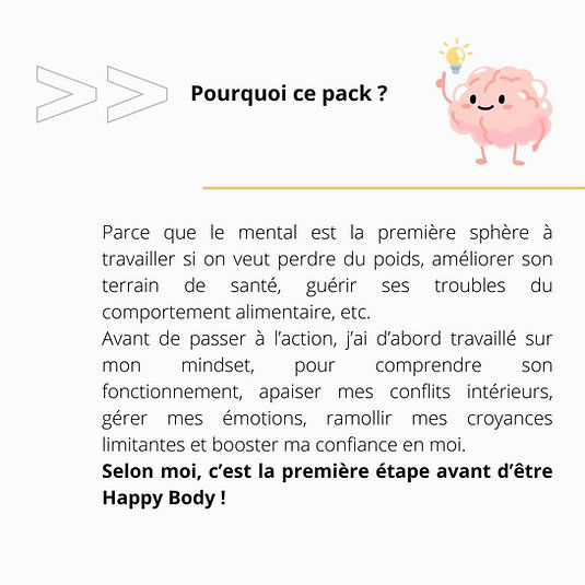 - Le ebook “Ma méthode pour avoir le mental Happy Body” : qui comprend 100 pages d’informations sur toutes les notions à travailler, et la méthode d’auto-suggestion que j’utilise depuis plus de 10 ans.